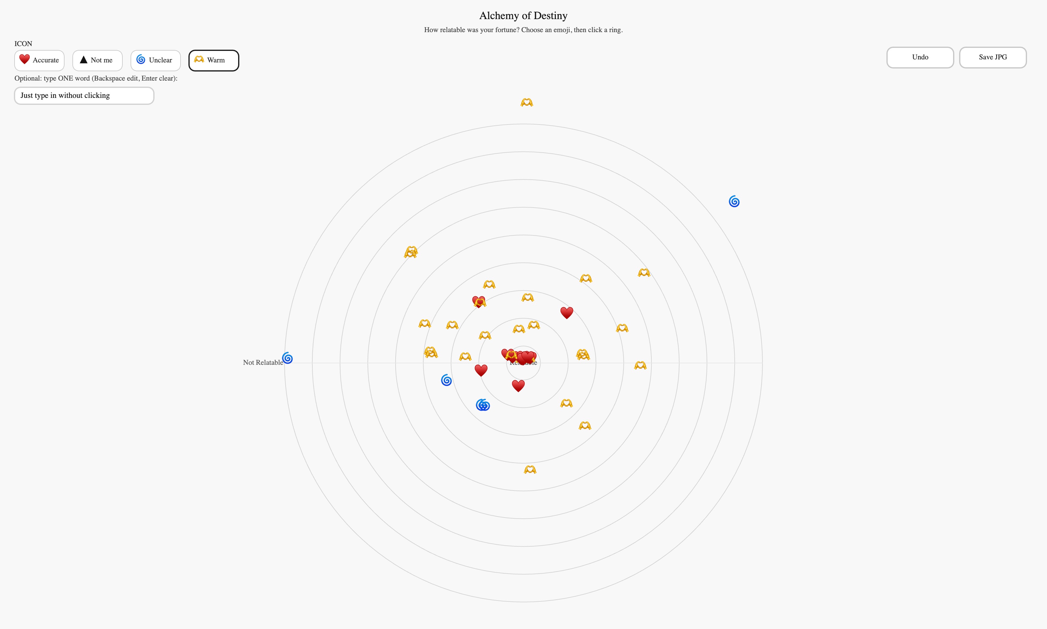 During the exhibition, participants were asked to stamp how relatable the fortune-telling sentence felt to them. They could choose from four different icons. During the exhibition, participants were asked to stamp how relatable the fortune-telling sentence felt to them. They could choose from four different icons. These responses were collected through a short question designed for data visualization, allowing participants’ emotional reactions to be visually mapped. As they adjusted the knobs and took time to reflect on their feelings, many participants felt heart-warmed by the encouraging words inside the box. Because the interaction was time-limited, some participants quickly made up their minds and waited for the roulette to stop. Others ran out of time and were unsure about their feelings, but they often reacted more strongly and felt especially heart-warmed after seeing the final outcome.